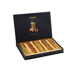 La boîte contient des pâtisseries tels que des Baklawa, Bourma, et d'autres variétés fourrées aux amandes ou aux pistaches et légèrement arrosé au miel.